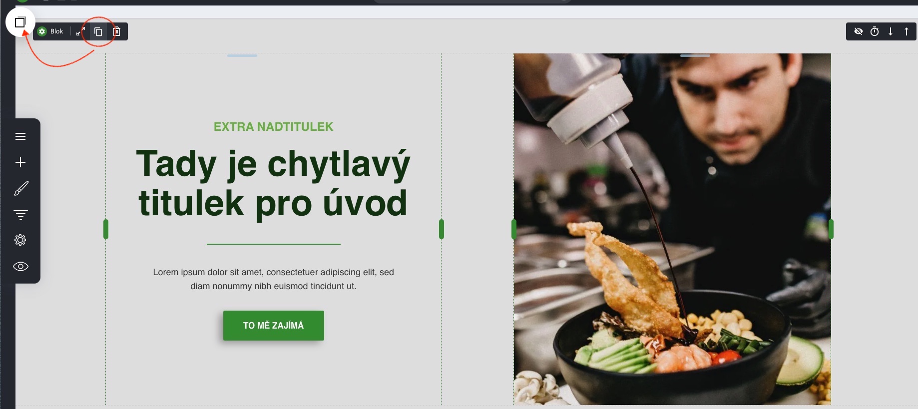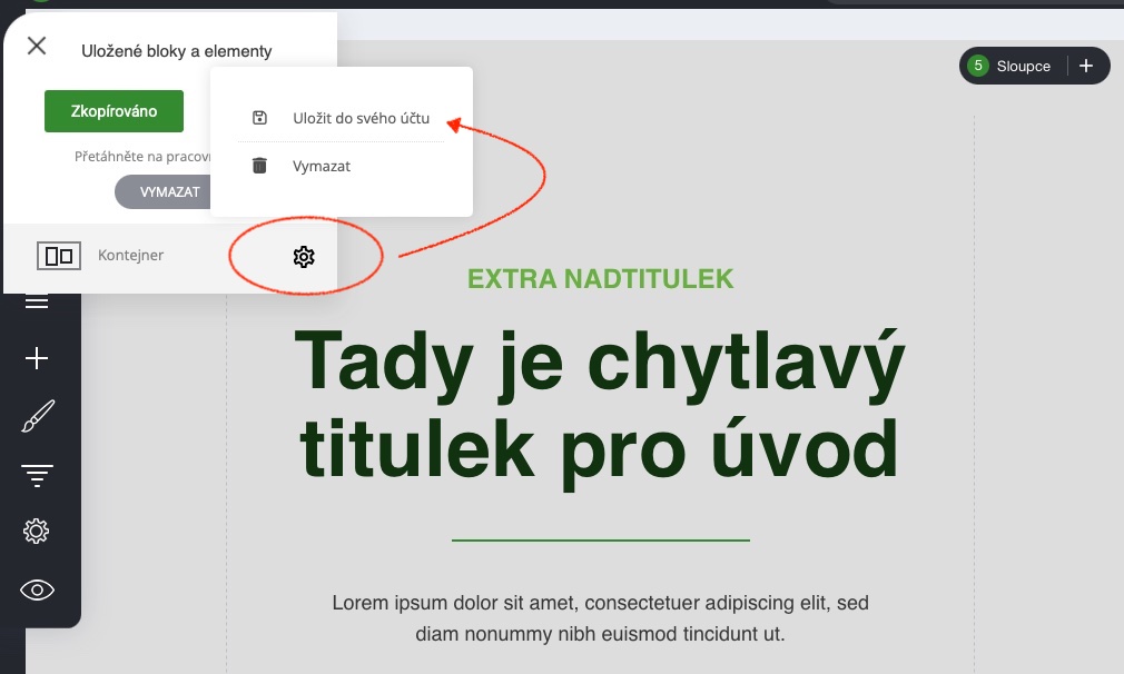 Tip: Pojmenujte si a uložte do svého účtu bloky nebo elementy, které často používáte. Mohou to být tlačítka, titulky, výzvy nebo skutečně i celé bloky, které chcete na stránkách opakovat.