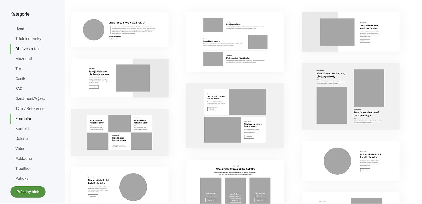 Po výběru karty bloků se zobrazí galerie předpřipravených bloků. Vyberte si ten, který se vám líbí, a bude přidán na vaši stránku k úpravám.