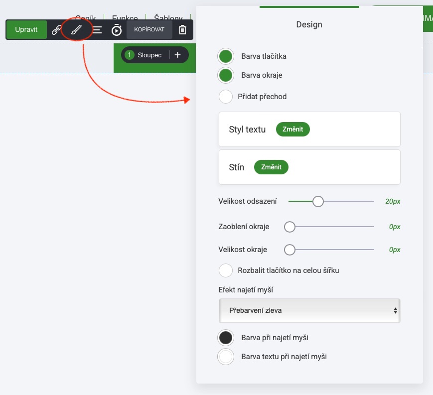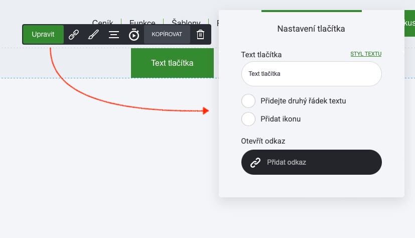 Na kartě Upravit můžete upravit text tlačítka, přidat druhý řádek textu, přidat ikony před nebo za text a připojit odkaz, který návštěvníka po kliknutí na tlačítko přesměruje.