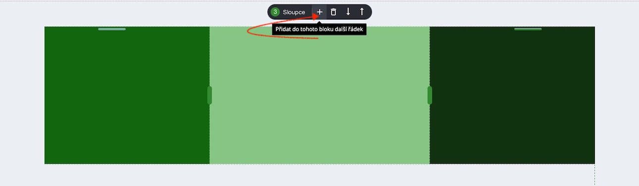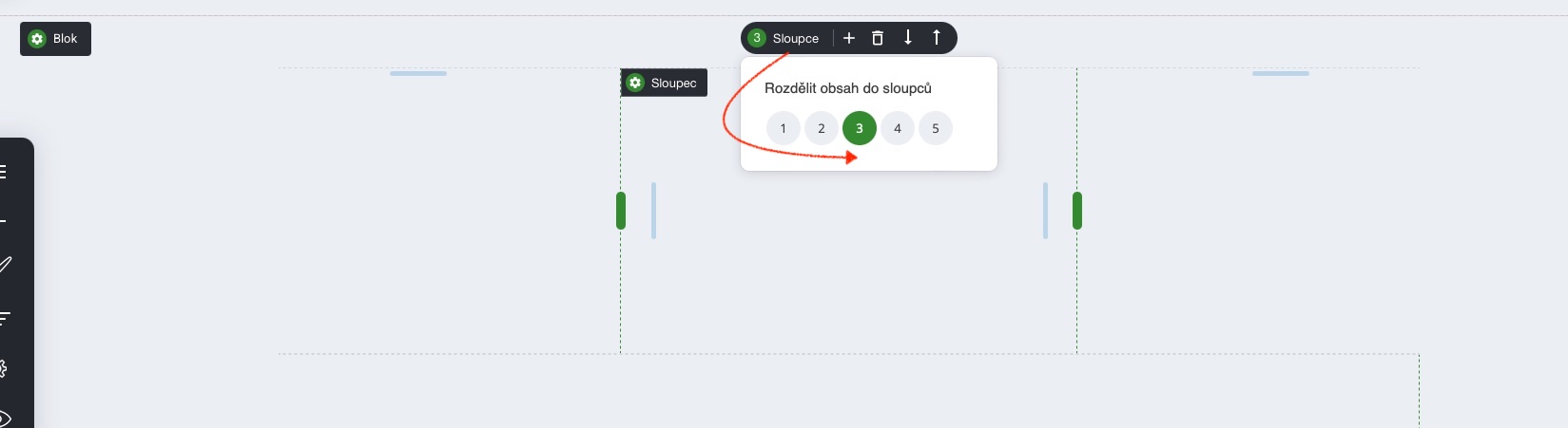 Chcete-li blok rozdělit až na 5 sloupců, najeďte myší na horní část vybraného bloku. Zobrazí se tlačítko pro provedení rozdělení.