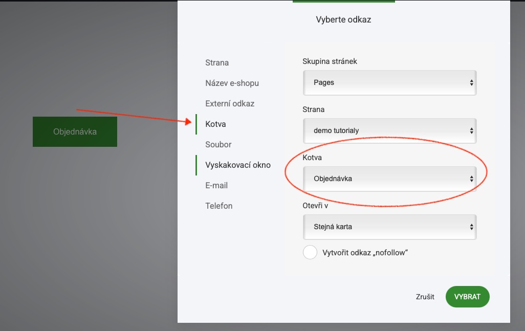 Pokud máte na webu tlačítko a chcete, aby se uživatelé dostali přímo do sekce, kde je umístěna kotva, je možné kotvu vybrat v nastavení odkazu NEBO vložit externí odkaz s umístěním kotvy za adresu, tedy na příkld: mujweb.cz/mojestranka#mojekotva.