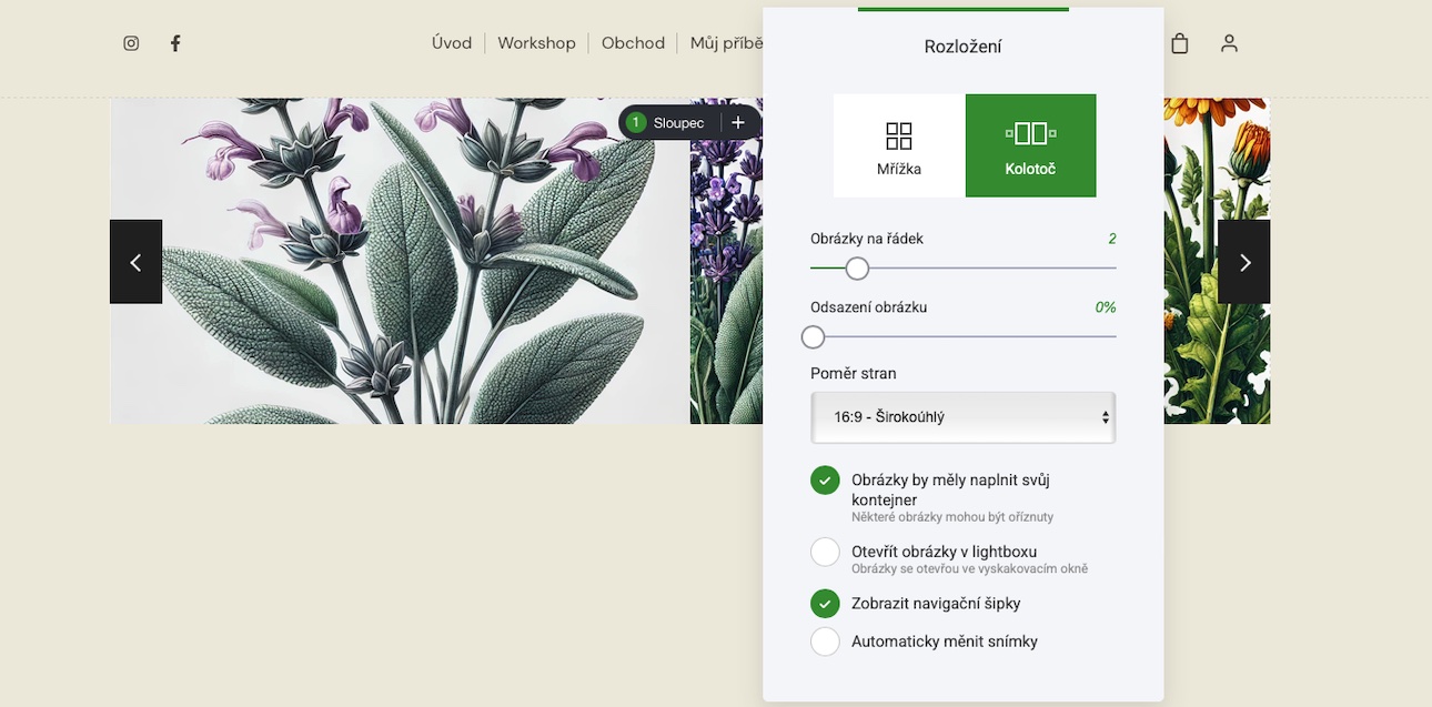 Pokud jste se rozhodli pro možnost kolotoče, máte možnost zobrazit navigační šipku, aby návštěvník mohl procházet snímky ručně nebo aby se snímky měnily automaticky podle času.