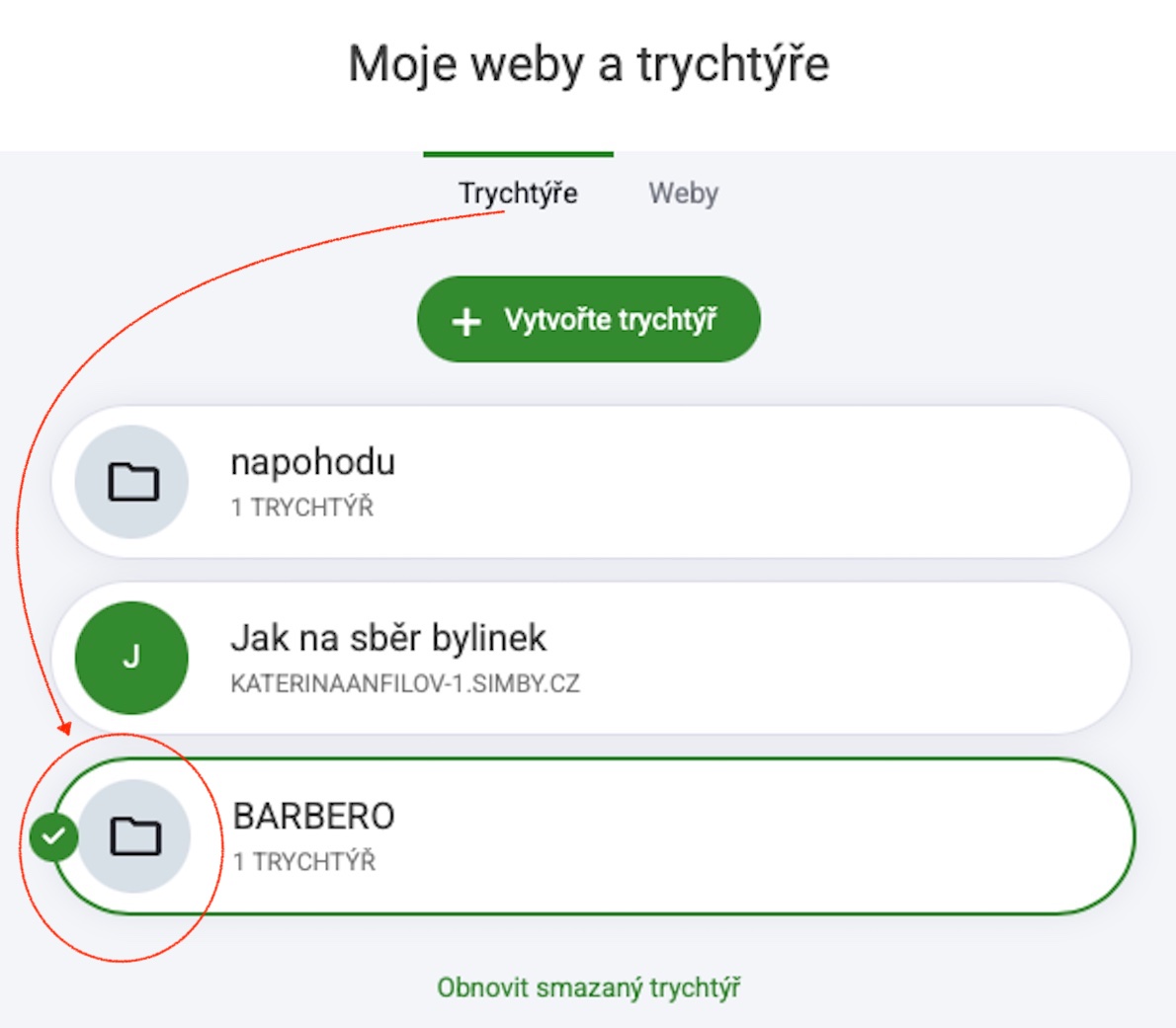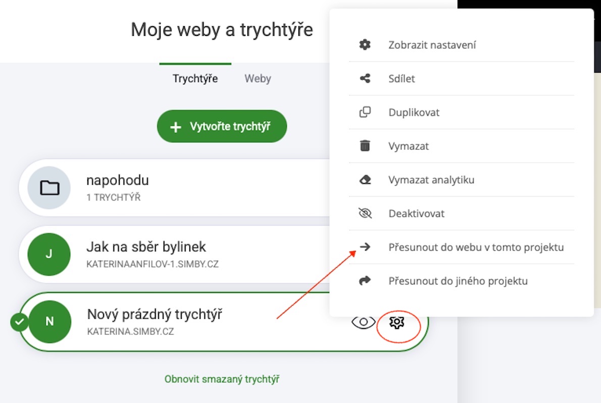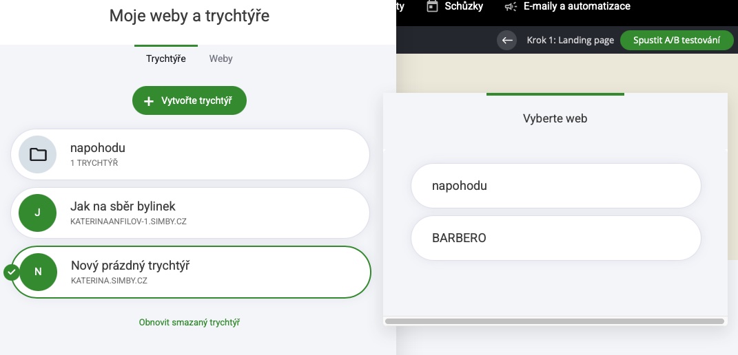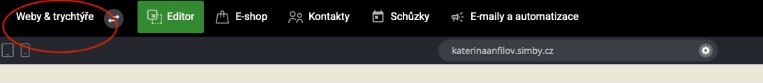 Weby: Zobrazí se všechny webové stránky, které jste vytvořili.