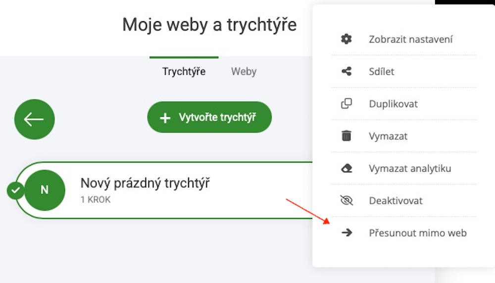 Tím se trychtýř neodstraní. Pouze jej přesunete. Zobrazí se také toto upozornění: "Opravdu chcete, aby tento trychtýř byl nezávislý na webu? Stávající produkty obchodu, objednávky, členové, kontakty a zprávy NEBUDOU PŘESUNUTY a zůstanou na webu. Pokračovat?".