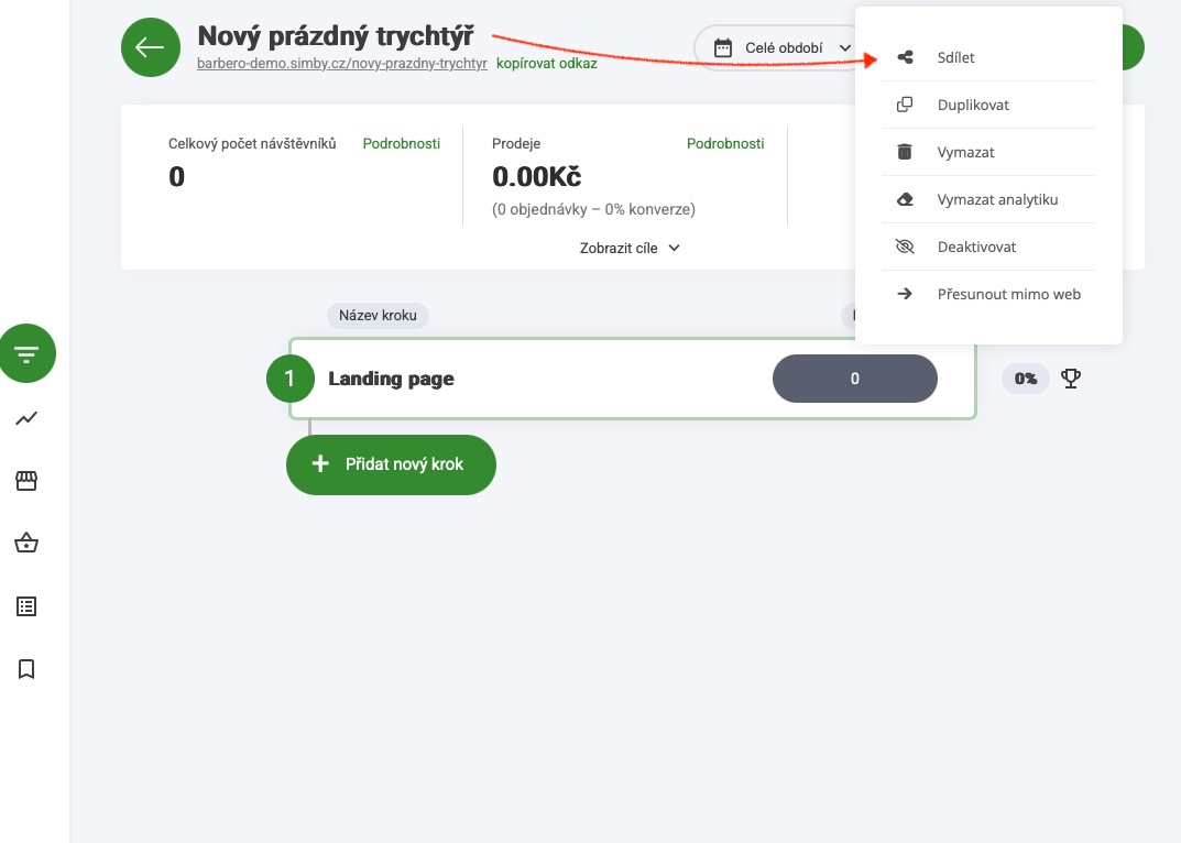 Sdílení trychtýře umožňuje sdílet celý trychtýř s jinou osobou. Pokud tedy například máte přítele, kterému se váš prodejní trychtýř líbí, a chcete ho prodat nebo jen zdarma sdílet, můžete. Jednoduše přejděte na kartu Možnosti trychtýře a vyberte možnost Sdílet. Nabídne vám to vlastní odkaz, který můžete sdílet nebo v případě prodeje přidat do e-mailu nebo použít jako stránku s přesměrováním.
