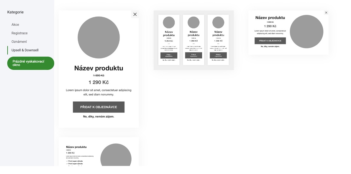 V tomto příkladu to bude jednoduché a vybereme možnost vyskakovacího okna, ale stejný princip platí i pro použití stránek. Když vyberete stránku nebo vyskakovací okno, zobrazí se naše předpřipravené upsell/downsell stránky a vyskakovací okna.