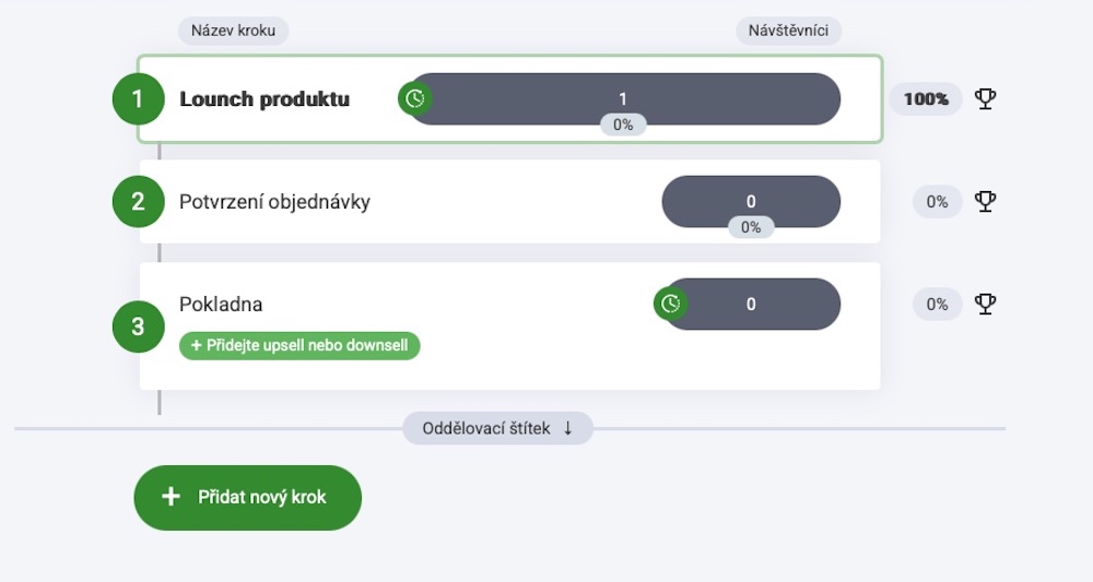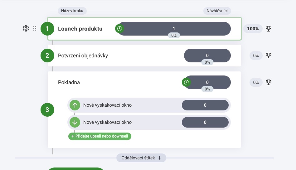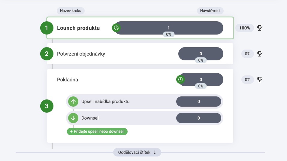 V rámci trychtýře můžete vytvářet neomezený počet upsellů a downsellů.