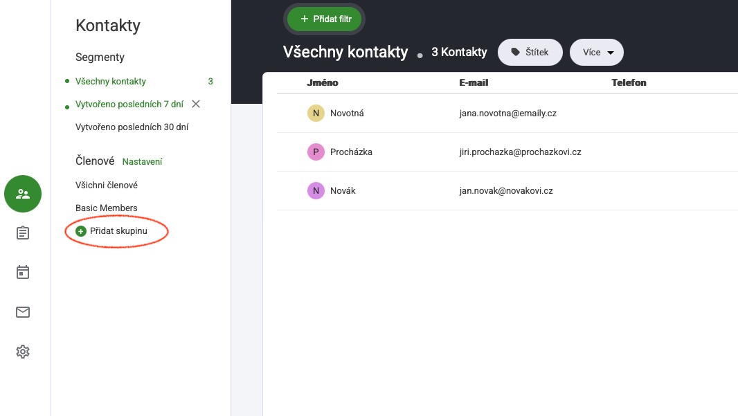 Chcete-li začít vytvářet členské skupiny: Přejděte na kartu kontaktů „CRM“ a vyberte možnost přidat skupinu, jak je zvýrazněno níže.