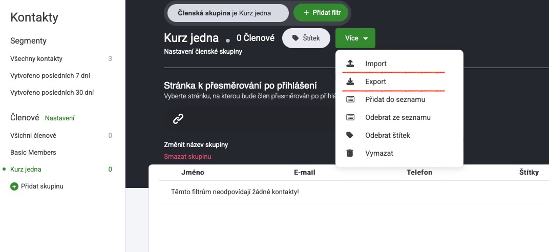 Pokud již máte existující seznam členů na jiné platformě nebo e-mailový seznam, můžete všechny členy automaticky importovat pomocí CSV. Pokud máte skupinu členů, kde požadujete přesunout uživatele z jedné skupiny do druhé. Pro tento případ můžete použít kartu Export.