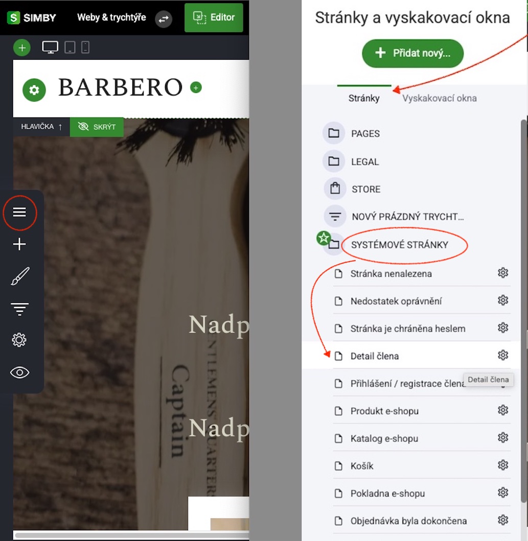 Úprava stránky pro správu členů: Přejděte do Editoru stránek na systémové stránky a vyberte možnost Detail člena. Jak je znázorněno níže: