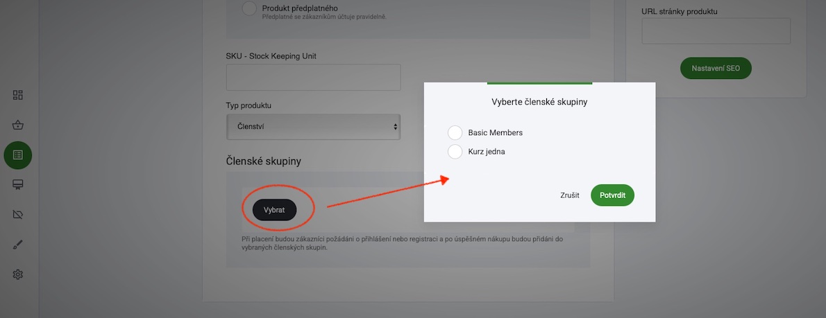 Stisknutím tlačítka vybrat se zobrazí nové vyskakovací okno. Zde můžete vybrat konkrétní skupinu členů, kterou chcete přiřadit k danému nákupu produktu.
