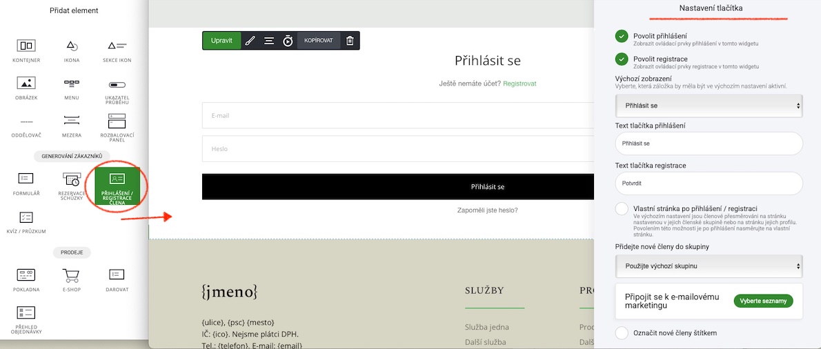 Přidání člena do skupiny pomocí elementu "přihlášení a registrace člena"