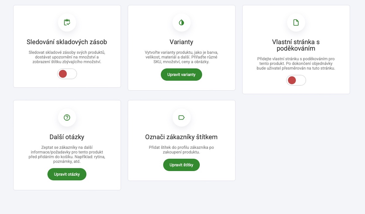 Po vytvoření produktu můžete začít přidávat další podrobnosti, od sledování zásob až po přidání štítků pro retargeting.