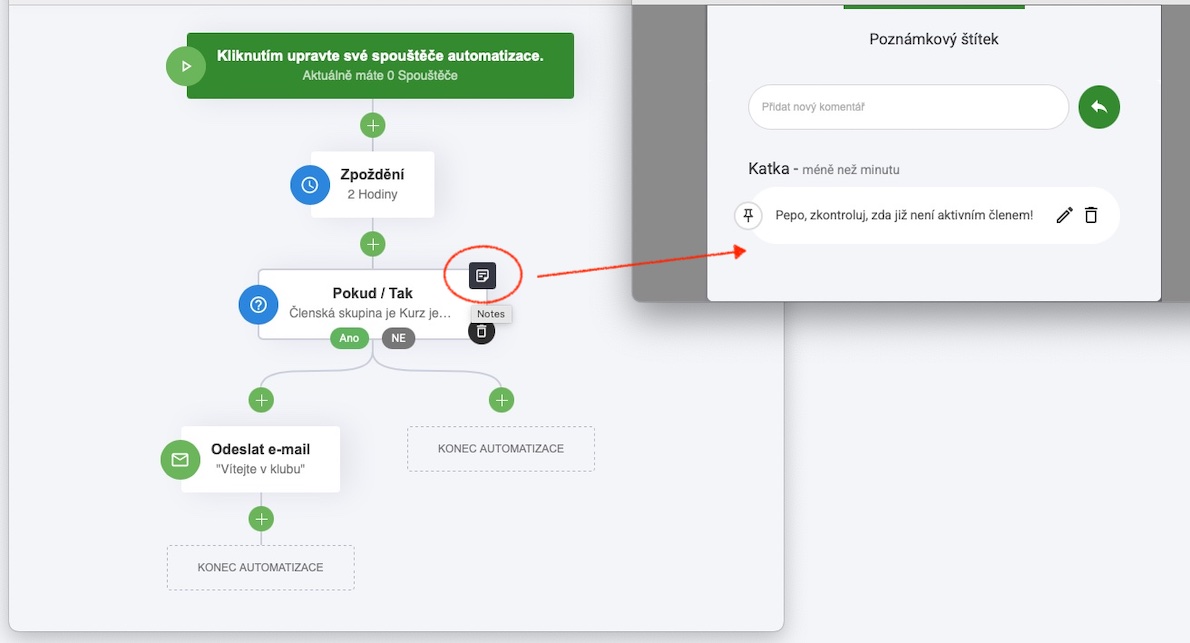 Výběrem funkce poznámek můžete vy nebo členové vašeho týmu zanechat užitečné poznámkové štítky v každém kroku automatizačního trychtýře. To může být opravdu užitečné, pro připomenutí informací o daném kroku nebo pro jednoduché přidání pokynů pro váš tým. Napište to, uložte to, připněte to.