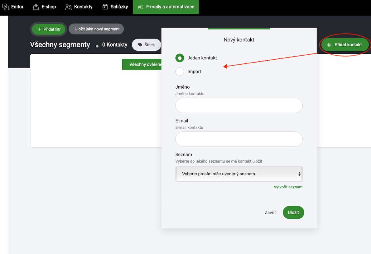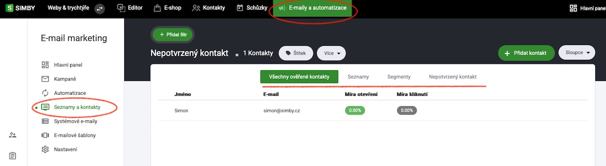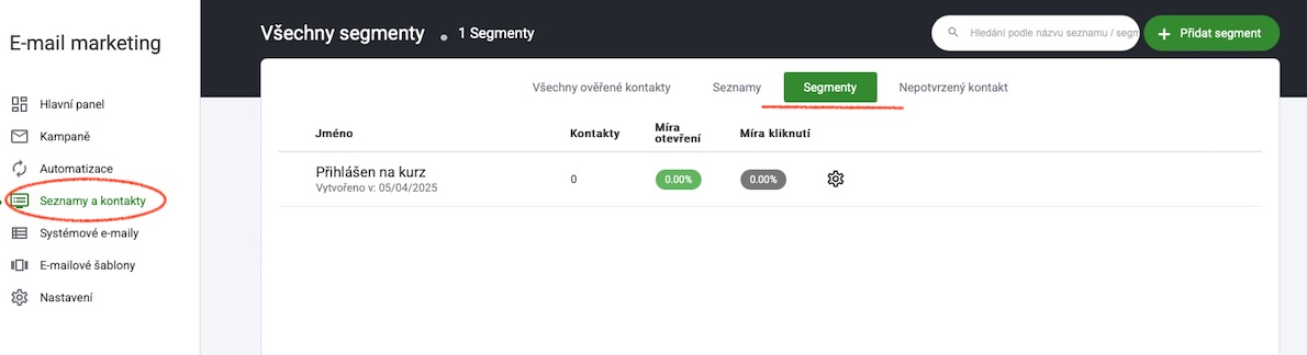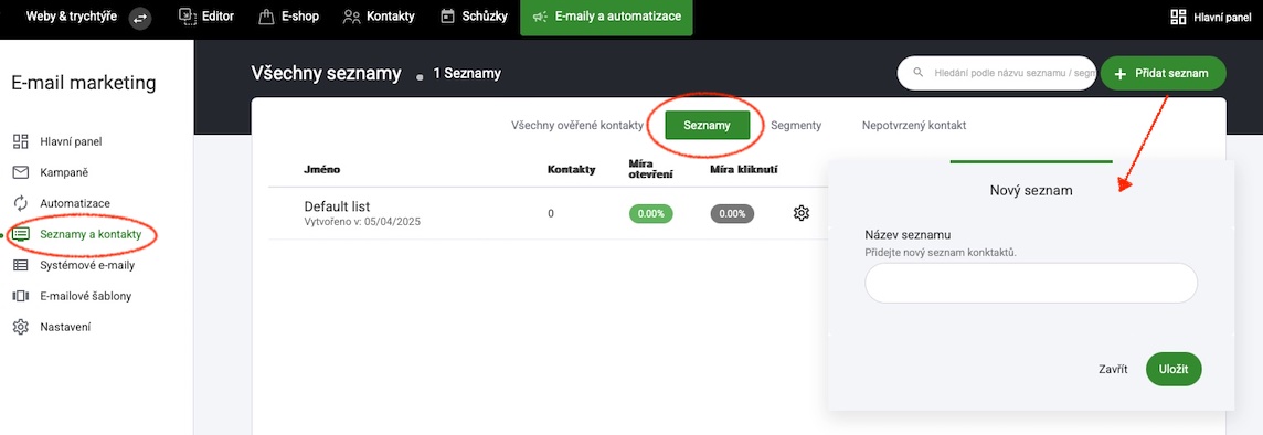 Záložka seznamy jsou seznamy a prostory, kam posíláte své kontakty/odběratele, abyste je mohli segmentovat a používat v rámci svých kampaní a automatizací.