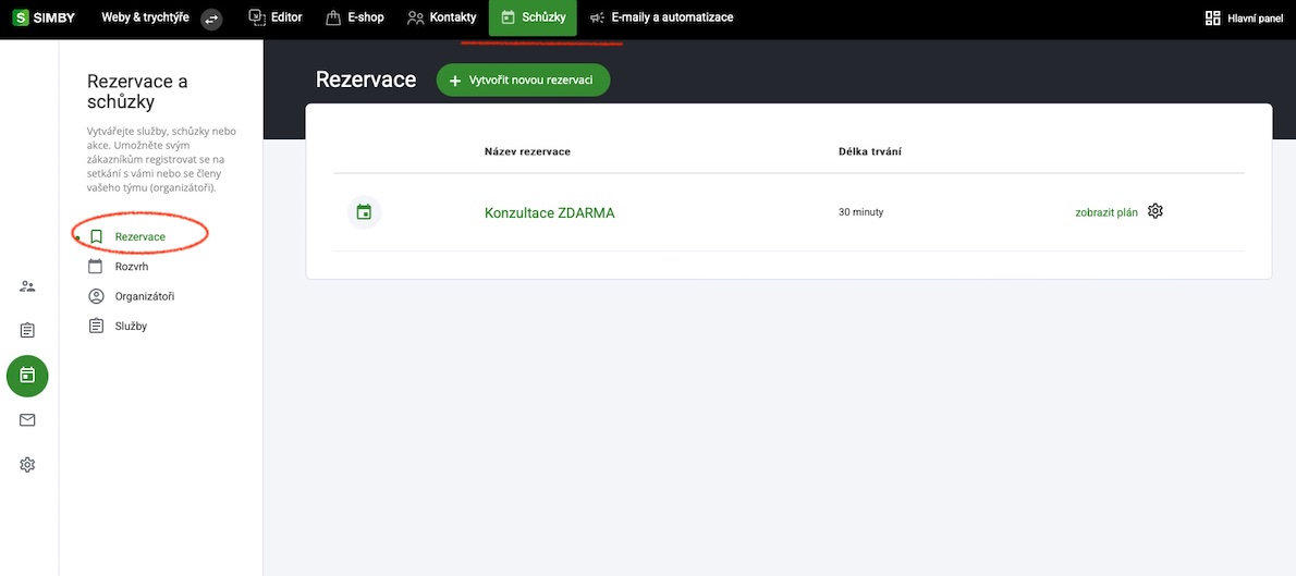 Nejprve přejděte na kartu Schůzky, která se nachází v horní liště, a vyberte možnost Vytvořit novou rezervaci.
