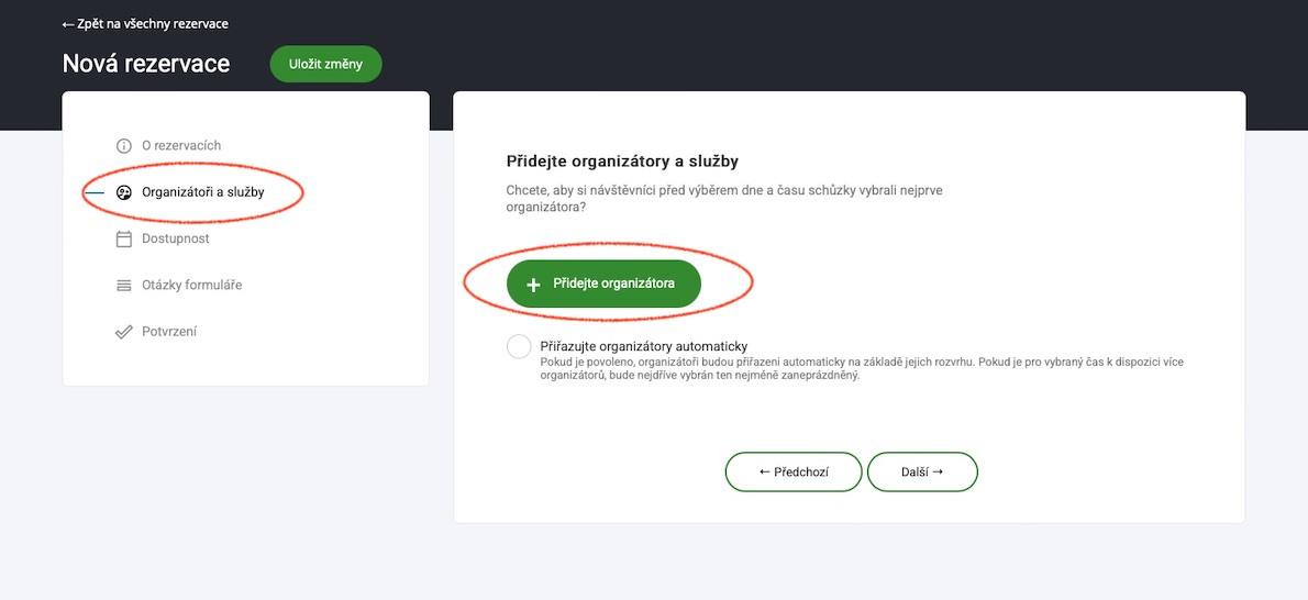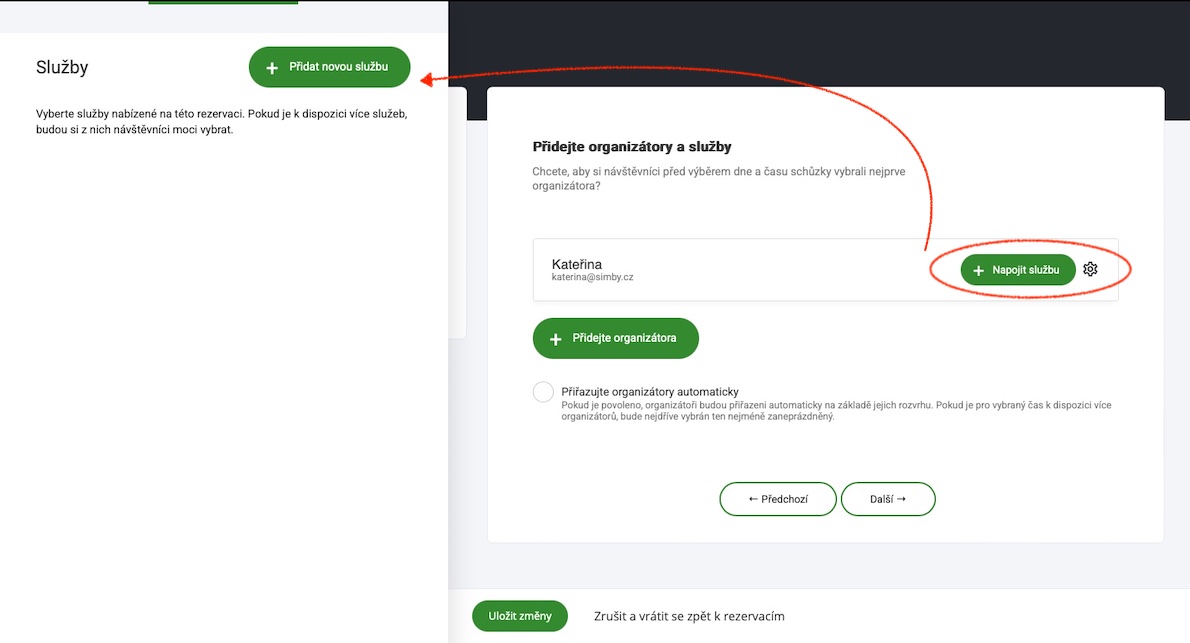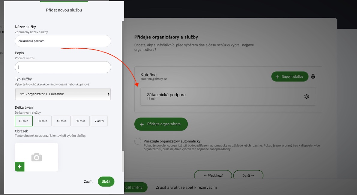Po vytvoření služby rezervace stačí klepnout na tlačítko přidat a služba se připojí k vytvořenému organizátorovi. Jak je znázorněno níže: