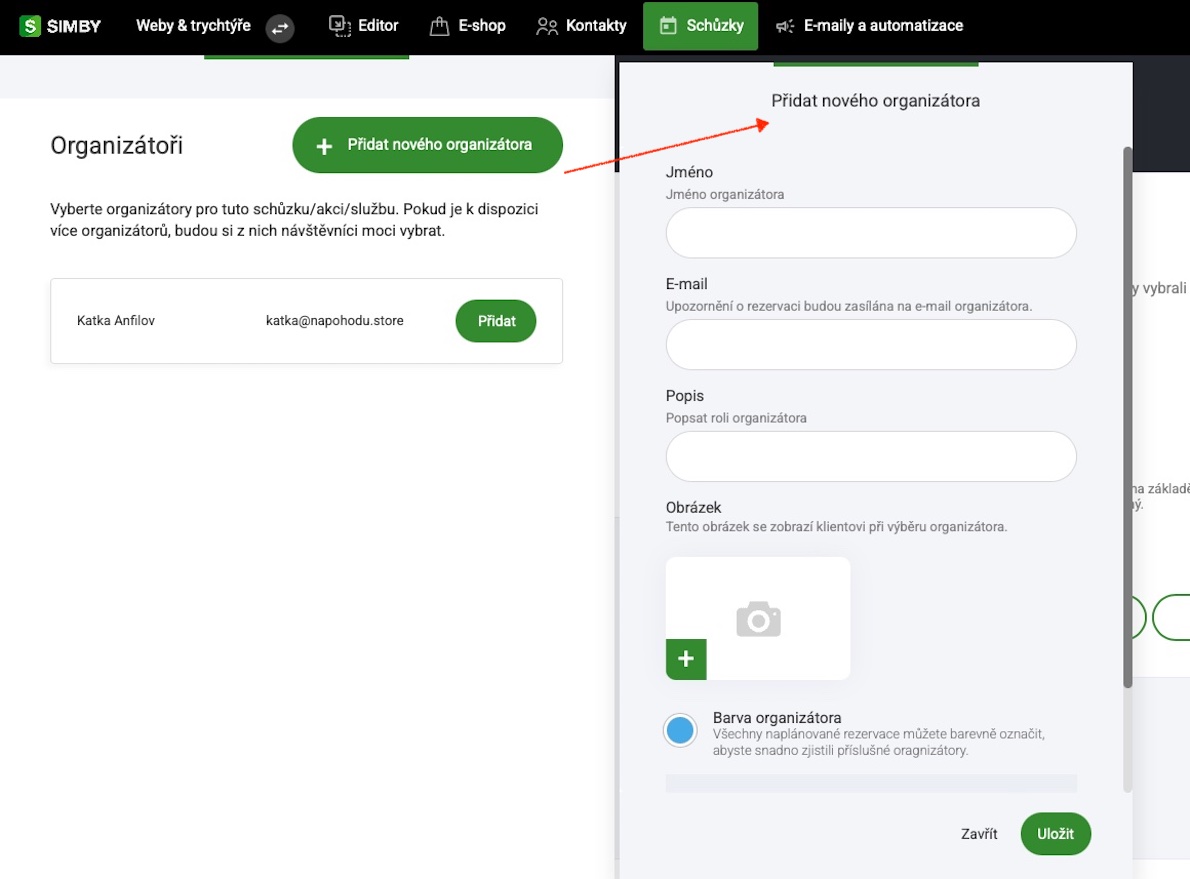 Nyní vyplňte údaje o organizátorovi. Každý organizátor může mít přidělenou vlastní barvu, která mu pomůže s prohlížením prostřednictvím stránky naplánované rezervace schůzky. Každý organizátor si také může nechat všechny schůzky odeslat a přidat přímo do svého vlastního kalendáře Google.