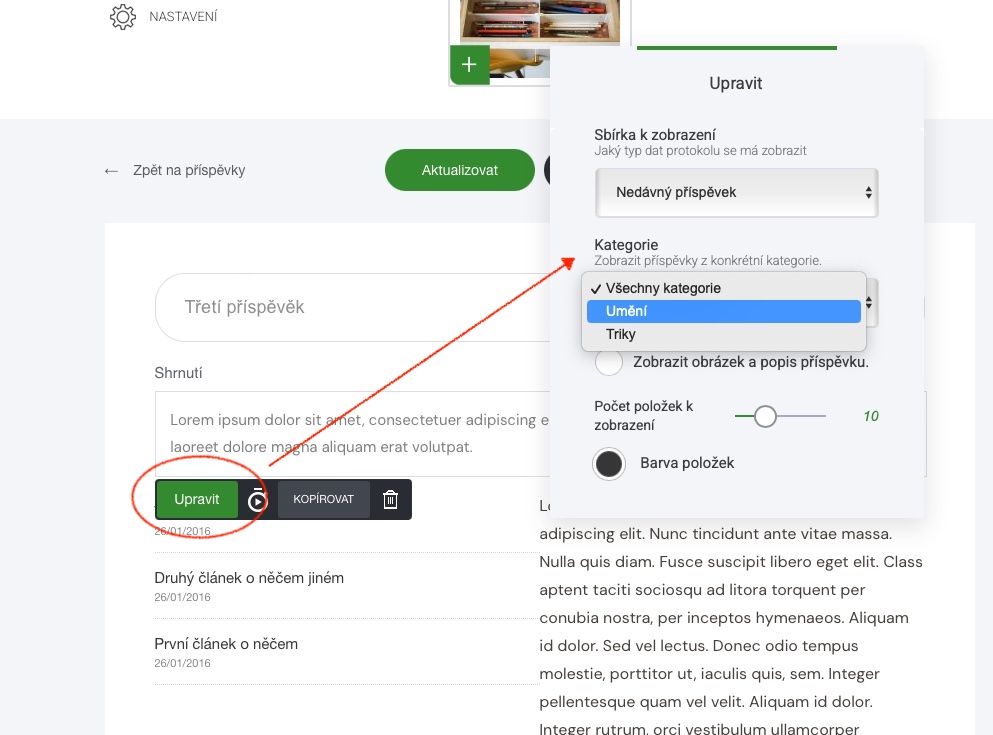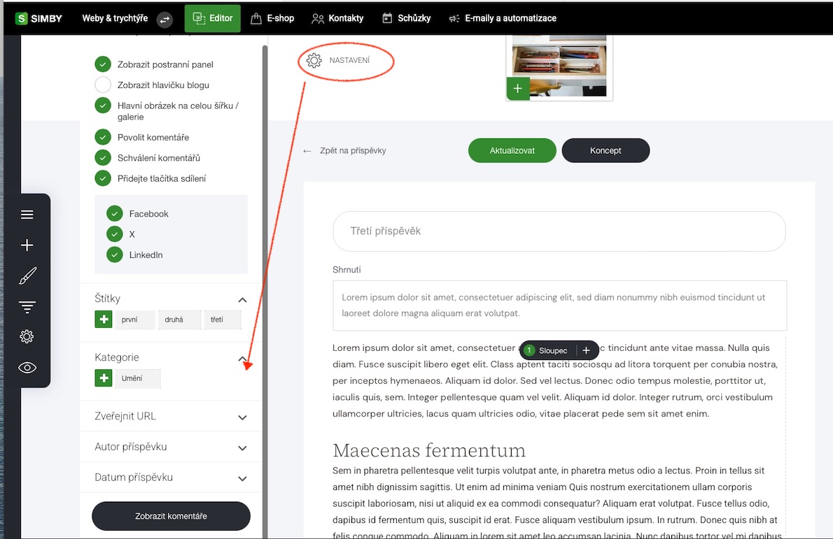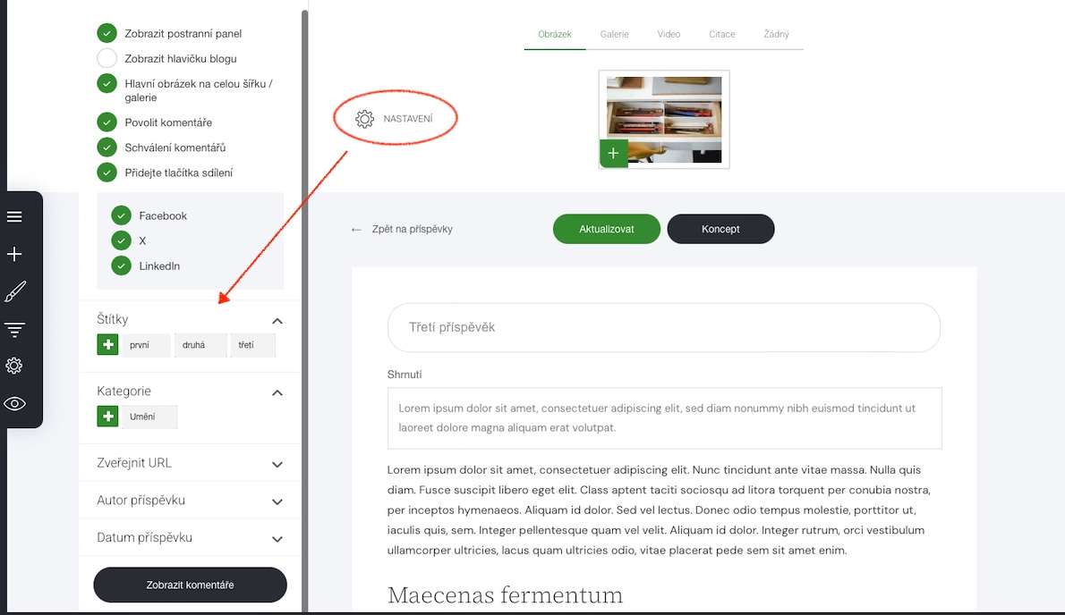 Pro přidání článku/příspěvku do kategorií přejděte do menu nastavení příspěvku a klikněte na tlačítko + v menu Kategorie. Poté zadejte nebo vyberte vaše kategorie a uložte.