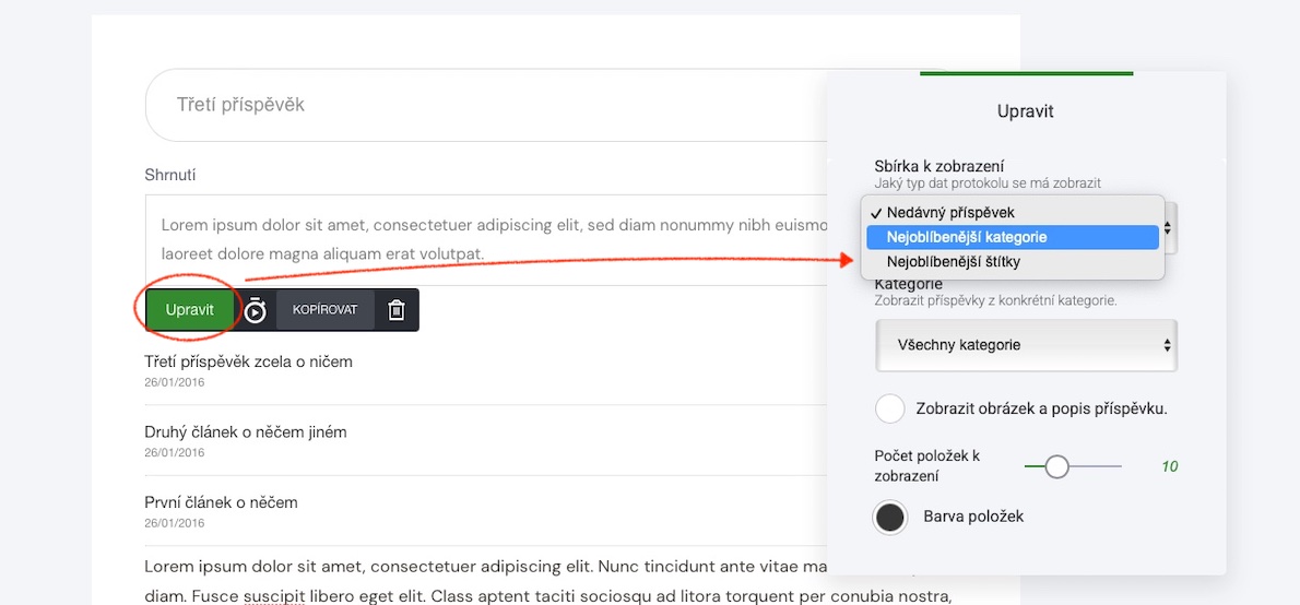 - Přes tlačítko upravit vyberte Nejpopulárnější štítky z rozbalovacího menu v nastavení elementu.