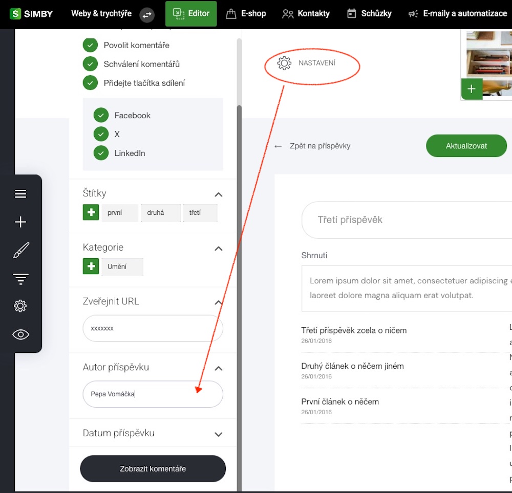 Pro nastavení jména autora, který napsal článek, přejděte do sekce Autor příspěvku v menu nastavení příspěvku a zadejte jméno autora.