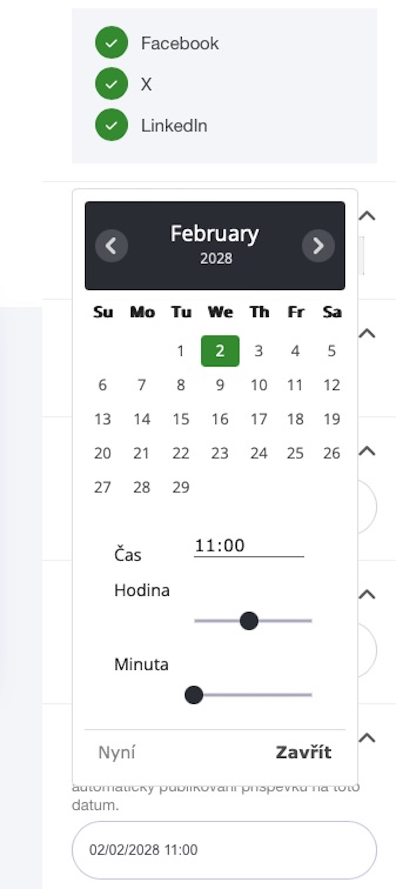 Pokud nastavíte datum a čas v poli Datum příspěvku v menu článku na budoucí datum, systém automaticky naplánuje publikaci příspěvku na toto datum a čas. Stačí nastavit a uložit.