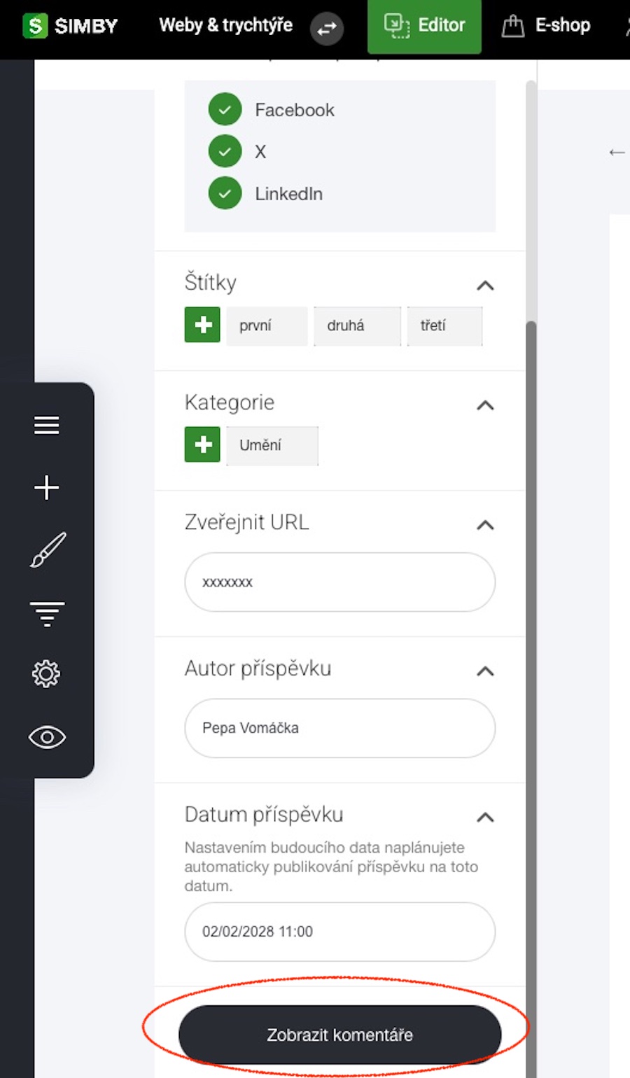 Pro nastavení nebo změnu URL článku/příspěvku na blogu přejděte do sekce Zveřejnit URL v menu nastavení příspěvku.