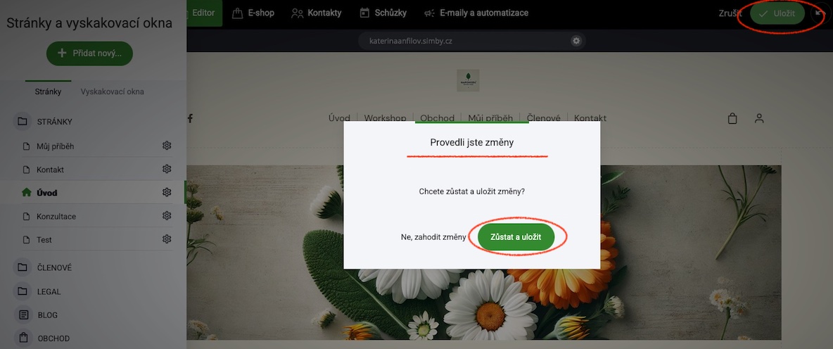 Změny uložíte vždy přes tlačítko "Uložit" v pravém horním rohu. Pokud změnu zapomenete uložit a přejdete ve vašem rozhraní jinam, zobrazí se vyskakovací okno s výzvou k uložení provedených změn, jak je znázorněno níže.
