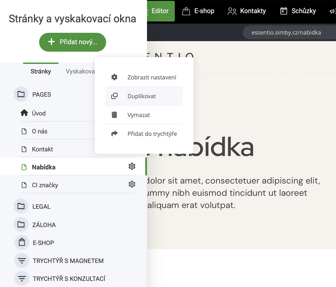 Stránka se se stejným názvem objeví v seznamu. Doporučujeme proto tuto stránku přejmenovat např. s dodatkem "záloha" a přidat do vytvoření skupiny stránek ZÁLOHA. Tak vám nebude překážet při práci na stránkách, na kterých aktivně pacujete.