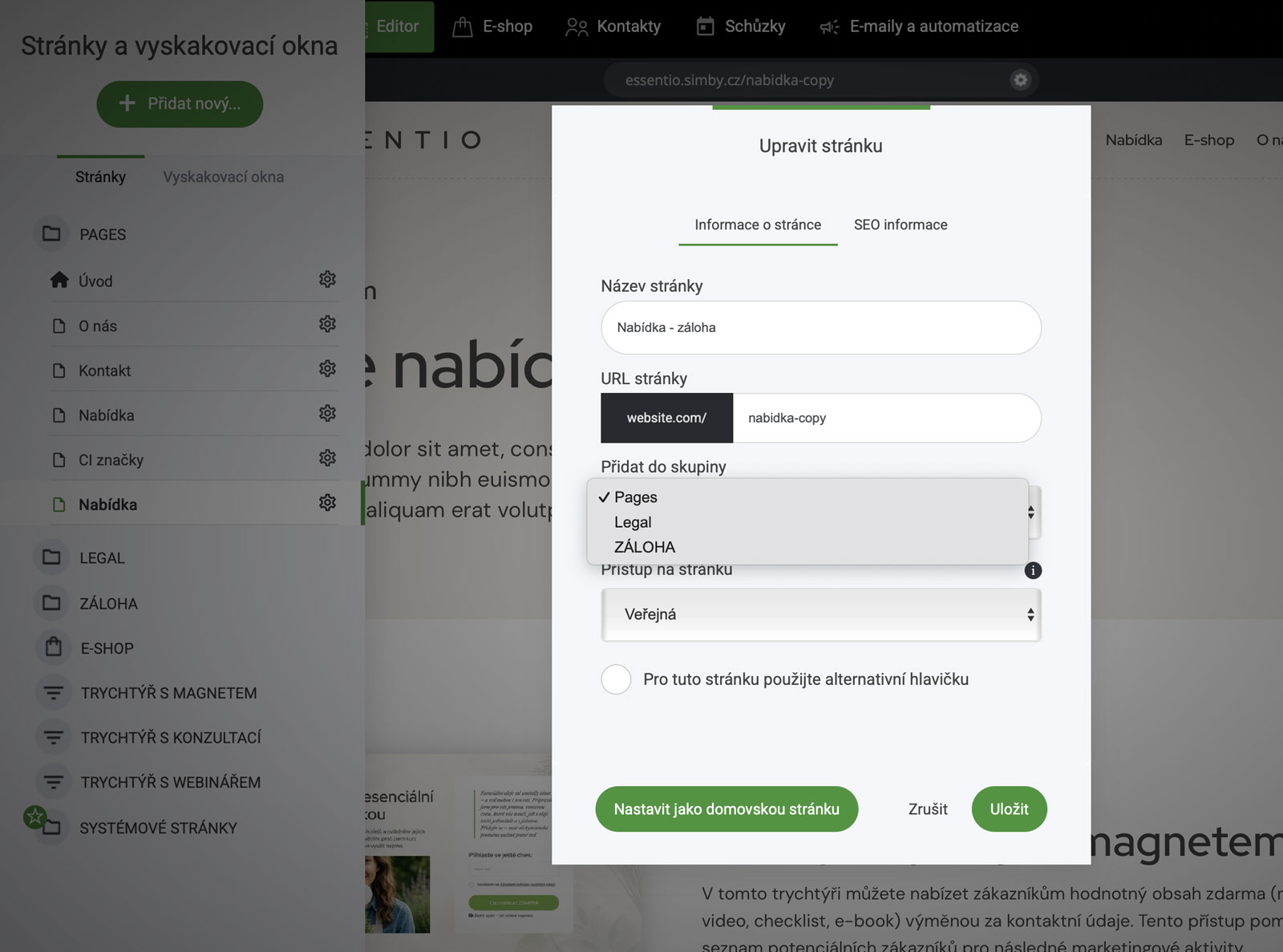 Vytvořte si na webu novou skupinou stránek a nazvěte ji třeba "ZÁLOHA".
