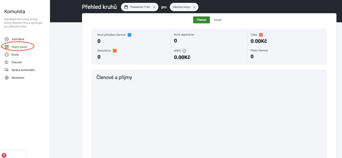 Na kartě Hlavní panel v komunitě, která se nachází na levé straně obrazovky, můžete zobrazit obecné informace o svých kruzích, včetně počtu členů, příjmů generovaných v rámci konkrétní komunity nebo kruhu a přehledu o zapojeném obsahu, jako jsou videa a další.