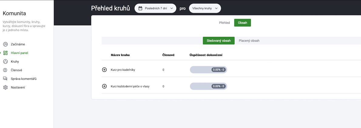 Na kartě Obsah můžete zobrazit veškerý obsah videí, který jste nastavili ke sledování. Pokud nabízíte placený přístup ke svým komunitám nebo kruhům, budete si zde moci zobrazit také související údaje.