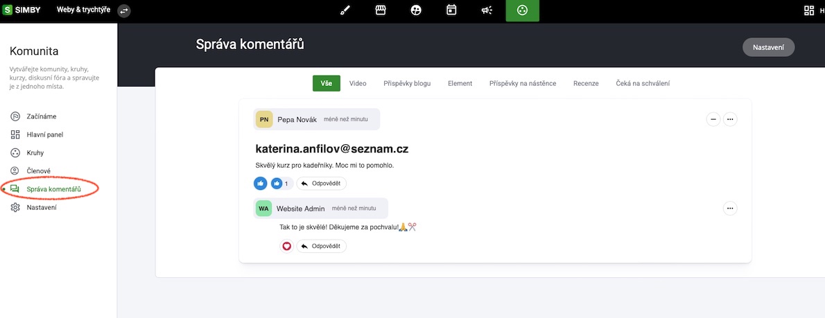 Správa komentářů nabízí jednoduchý a uživatelsky přívětivý způsob správy veškerého obsahu sdíleného ve vaší komunitě. Umožňuje vám snadno kontrolovat příspěvky, komentáře a odpovědi a reagovat na ně z jednoho centrálního místa. To pomáhá vytvářet bezpečné, zajímavé a podpůrné prostředí, ve kterém se členové cítí vyslyšeni a oceňováni.